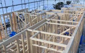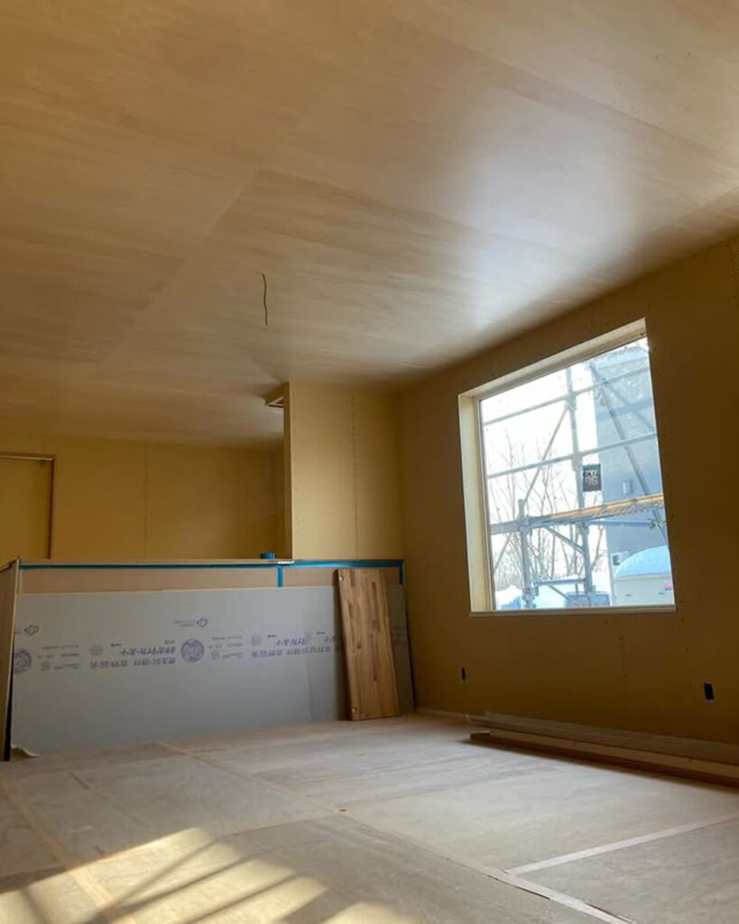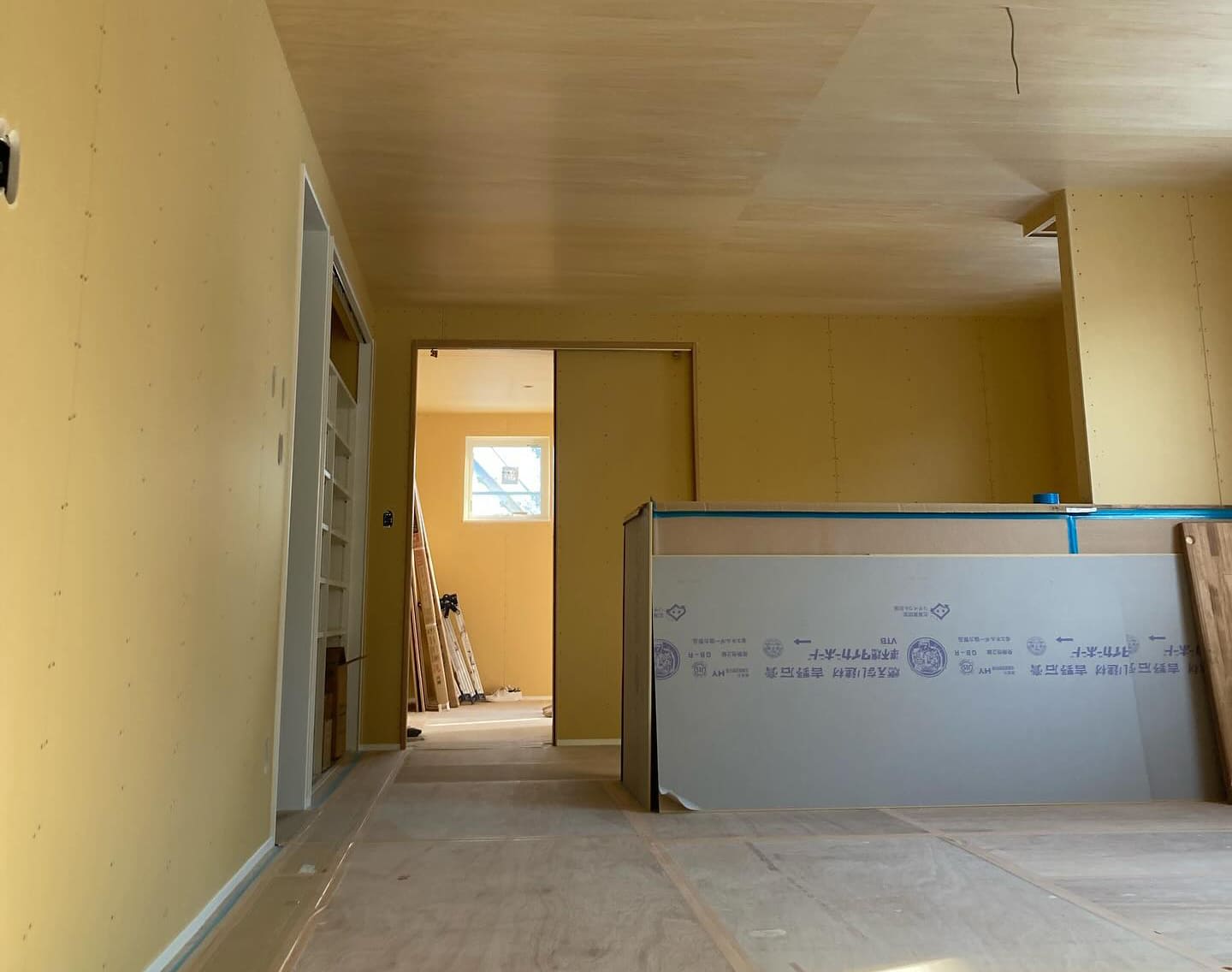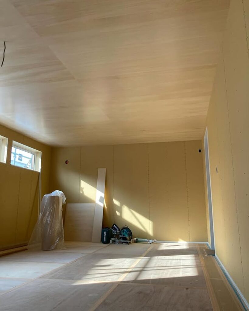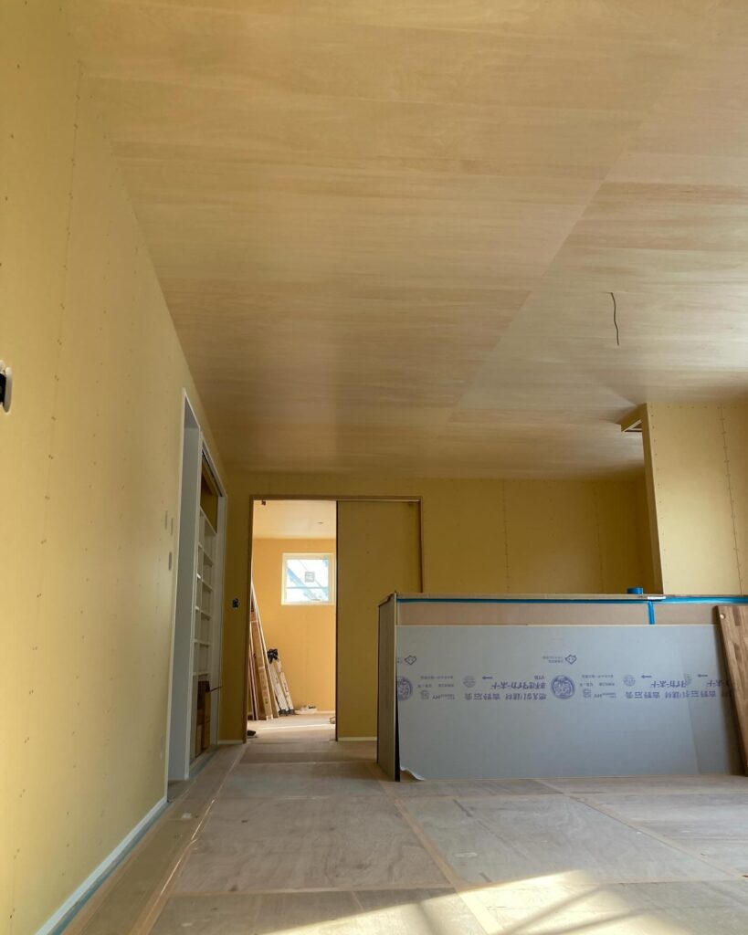 天井をスッキリめの板貼り、現在クロス工事進行中。
