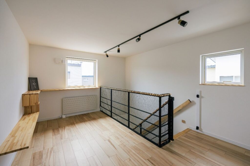 2階の共有ホールには、お施主様のご希望に沿った複雑な造作棚