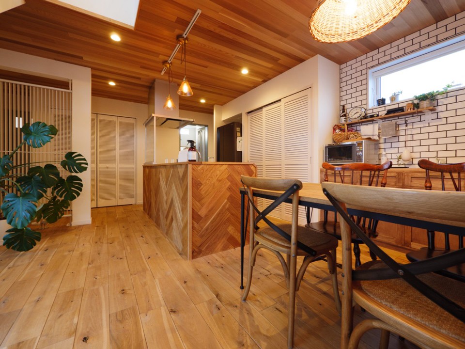 キッチンは既製品ですが、その周囲を大工さんの造作でフィッシュボーン柄に